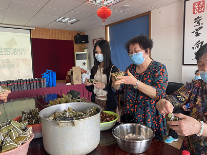 社區(qū)工作人員提前買好了糯米、粽葉等包粽子的材料,并做好了前期的淘米、洗粽葉等衛(wèi)生準(zhǔn)備工作。包粽子活動(dòng)現(xiàn)場歡聲笑語、其樂融融,很快一個(gè)個(gè)各式各樣的漂亮粽子就這樣在大家的手中誕生了。