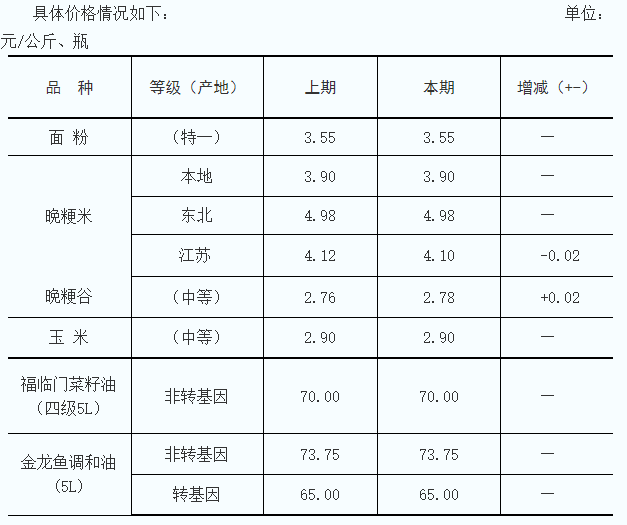 據(jù)監(jiān)測(cè),202211日~117日,目前氣溫適宜糧油儲(chǔ)存,加上春節(jié)臨近,糧油將迎來(lái)銷(xiāo)售旺季,市區(qū)各糧油經(jīng)銷(xiāo)商備貨積極,市場(chǎng)成品糧油供應(yīng)品種豐富、貨源充足、銷(xiāo)售價(jià)格穩(wěn)定、供應(yīng)秩序良好。原糧晚粳谷市場(chǎng)價(jià)格小幅上漲,市場(chǎng)價(jià)格走勢(shì)向上;飼料市場(chǎng)供應(yīng)價(jià)格穩(wěn)定,貨源供應(yīng)充足,但銷(xiāo)售價(jià)格仍處于高位。