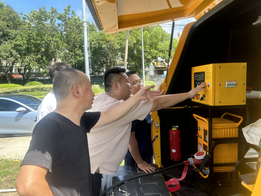 在廠商技術人員的講解下,庫區(qū)保管員與技術人員一起對排澇車的發(fā)動機、抽水系統(tǒng)、動力系統(tǒng)、抽水帶連接、電線配件等進行了細致的保養(yǎng)和維護,確保機器運行的穩(wěn)定性和高效性。